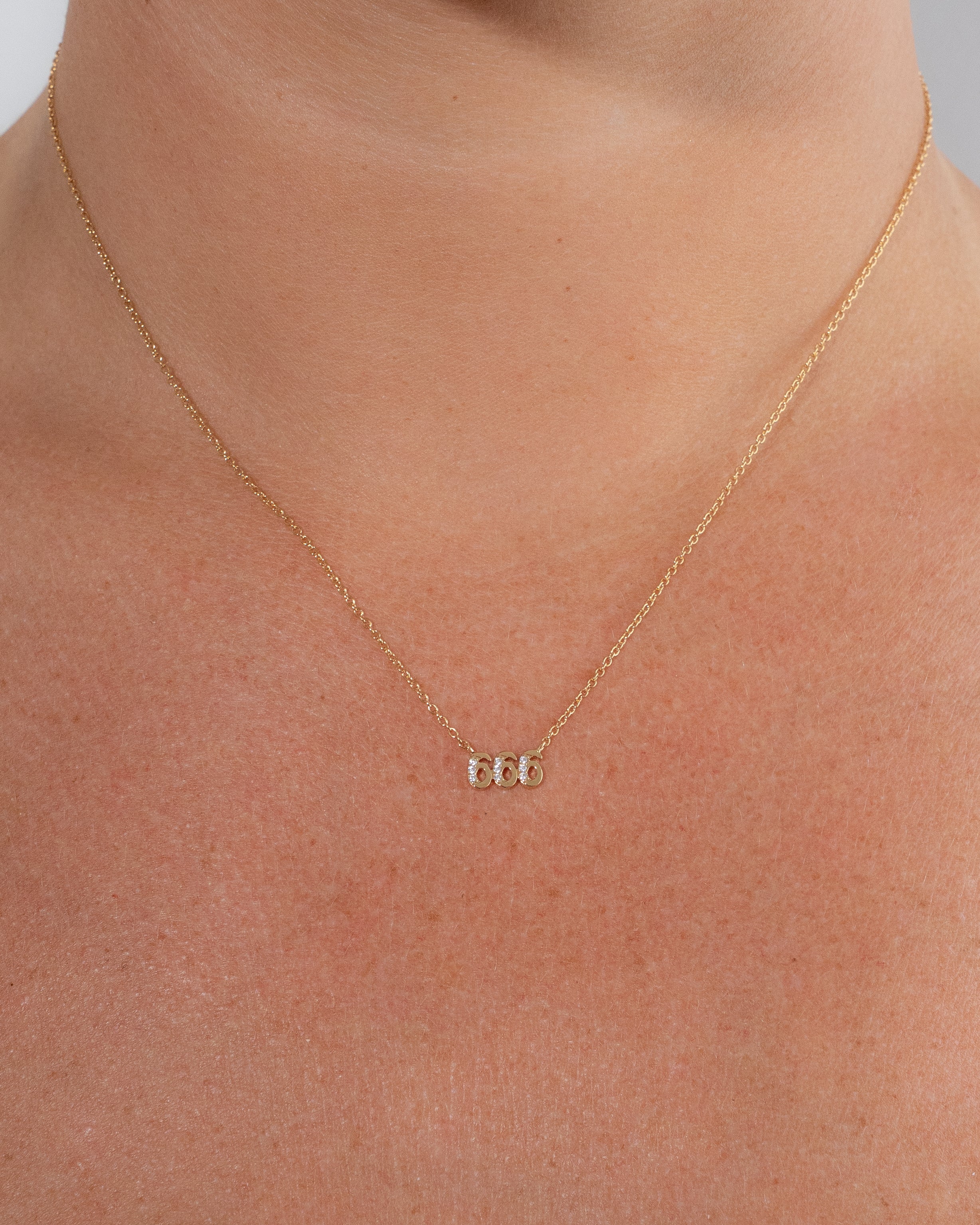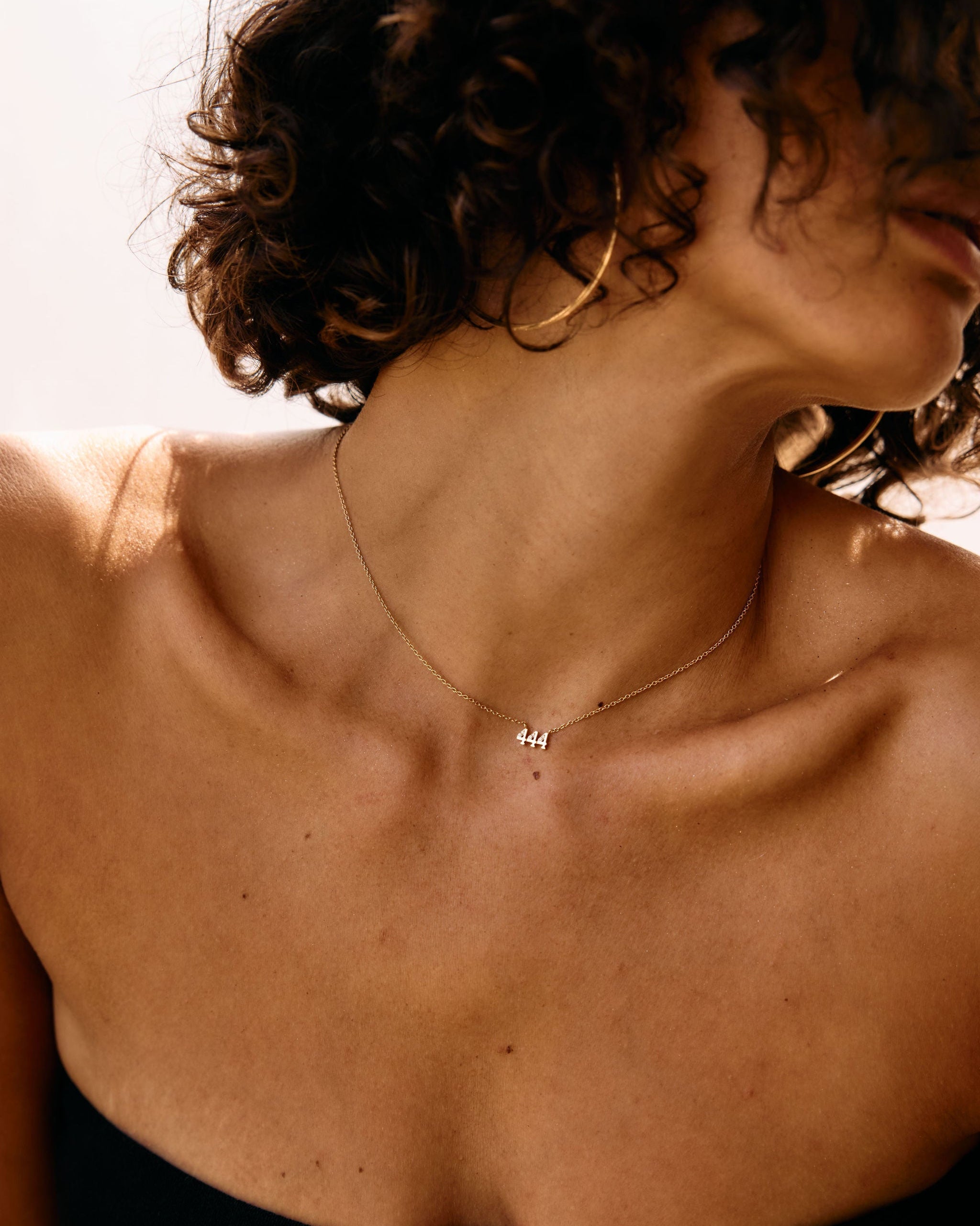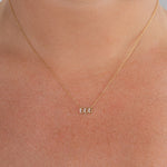 Close-up of a person wearing a delicate necklace with small pendants.
