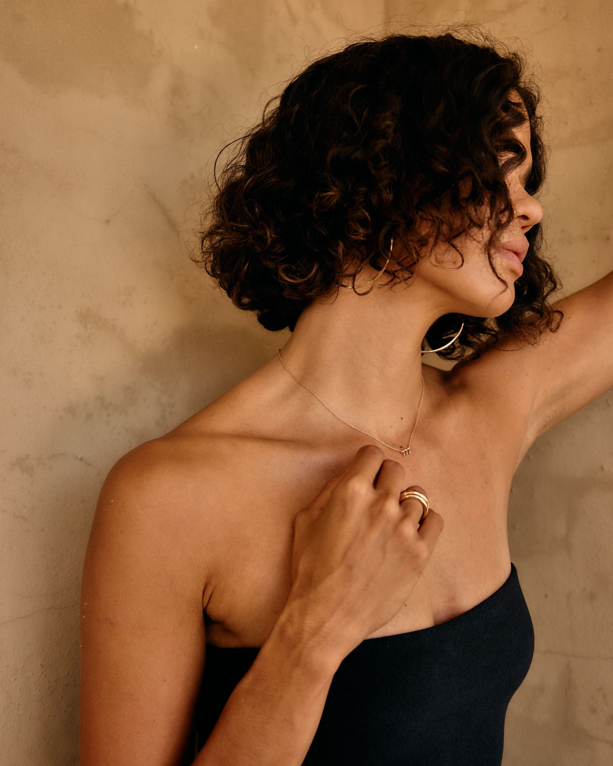 Woman with curly hair wearing a black dress against a beige wall