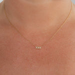 Close-up of a person wearing a delicate necklace with small pendants.