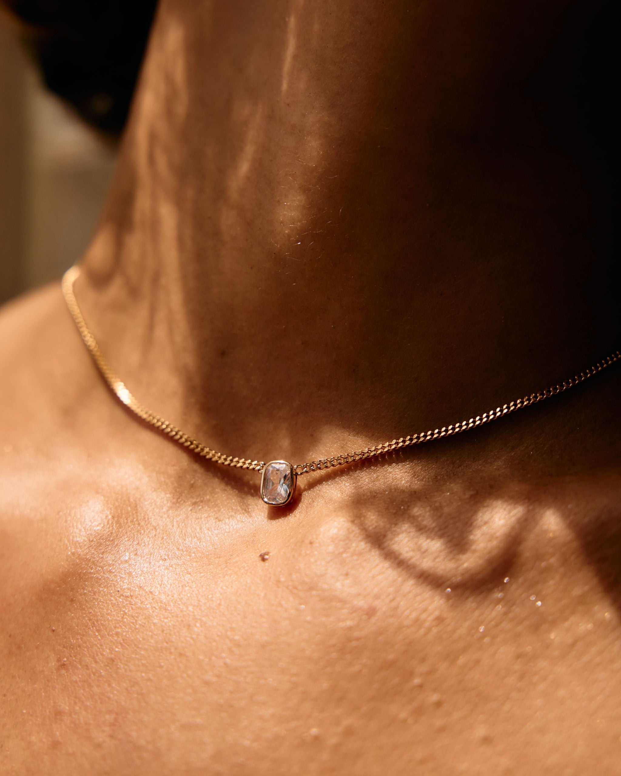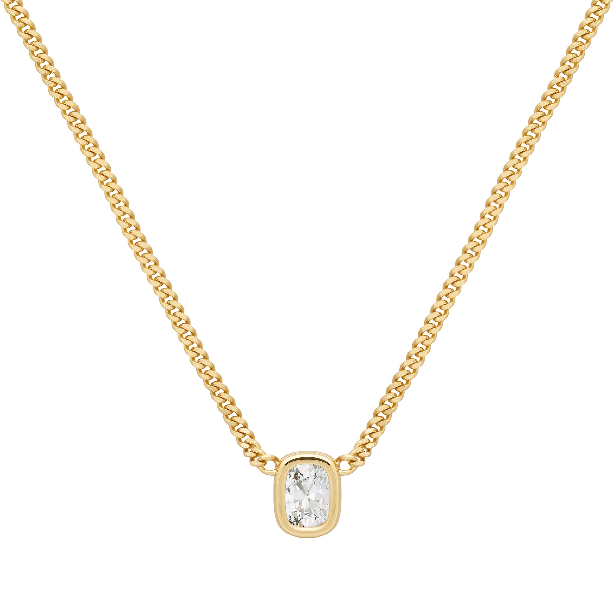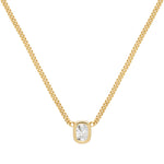 The Bella Necklace features an elongated cushion cut cubic zirconia (8.5mm x 6mm) cubic zirconia framed in a smooth bezel setting, creating a silhouette that feels both soft and sculptural. Suspended from a refined 3mm curb chain, it offers effortless brilliance in a timeless, wearable form.