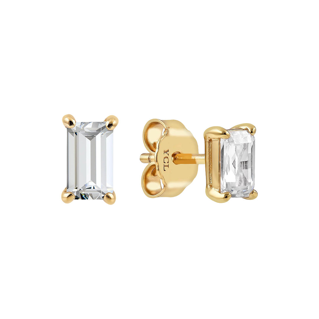 A modern interpretation of the Toi et Moi, two stones, side by side, symbolising connection. Featuring a pear cut and baguette cut cubic zirconia in sculptural bezel settings, these Huggie Hoops balance softness and structure in perfect harmony.