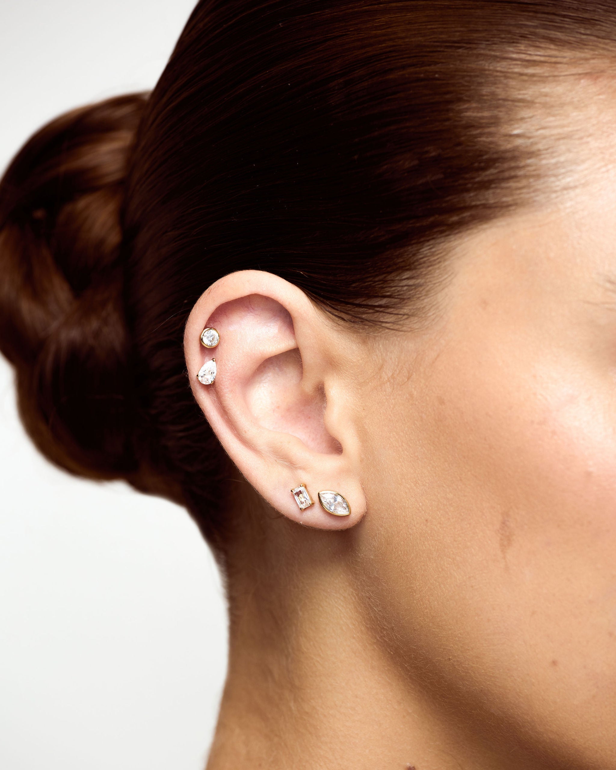 Close-up of an ear with multiple diamond stud earrings on a neutral background