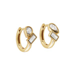 A modern interpretation of the Toi et Moi, two stones, side by side, symbolising connection. Featuring a pear cut and baguette cut cubic zirconia in sculptural bezel settings, these Huggie Hoops balance softness and structure in perfect harmony.